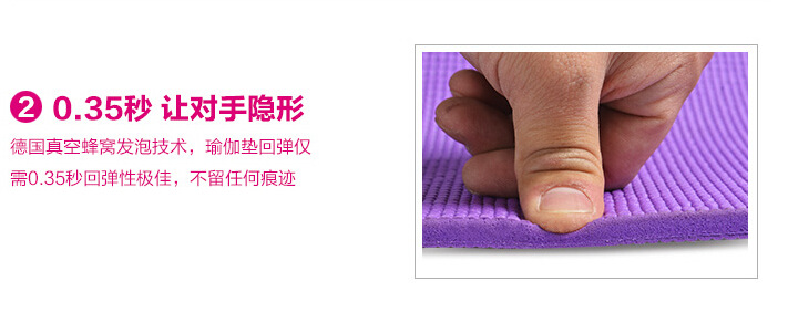 【材质】:PVC瑜伽垫选取进口的PVC材料,采用德国蜂窝发泡技术,环保无害,回弹快, 性价比高